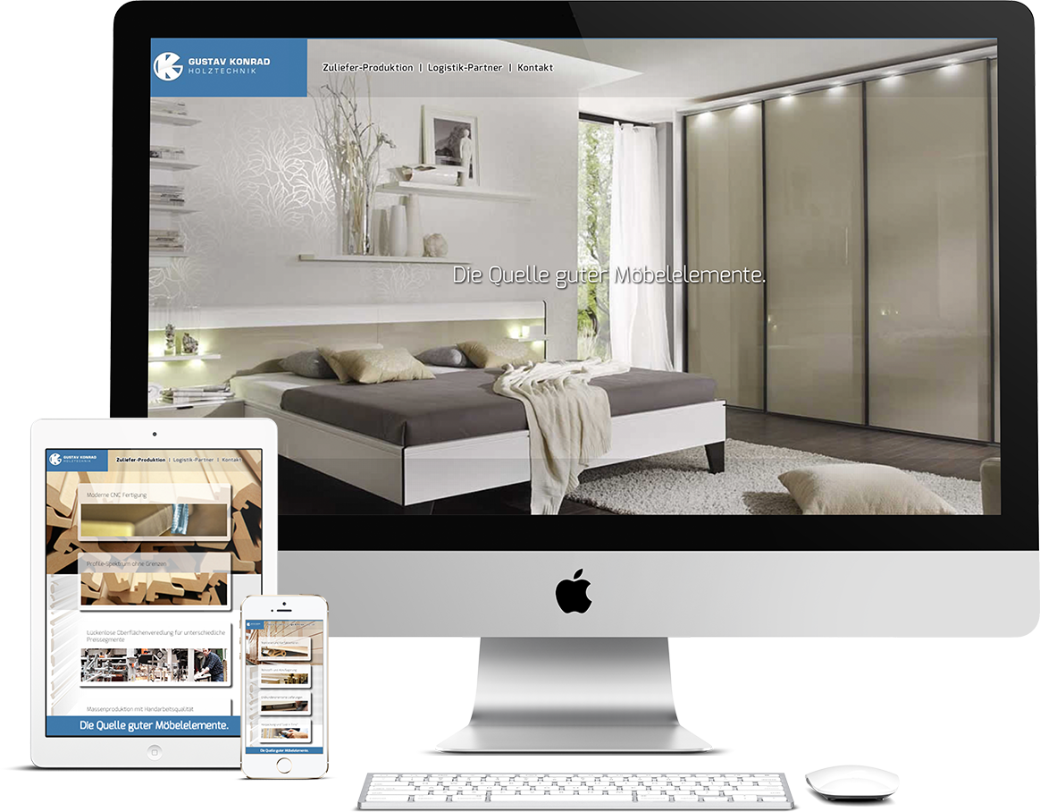 /Wir sagten es ja schon: Zwei Fäuste sind besser als eine. Gemeinsame mit unseren Freunden von T+ haben wir für die Gustav Konrad GmbH & Co. KG eine neue Webpräsenz gezaubert. Während die Marketingspezialisten und Grafikkünstler von T+ sich um das äußere Erscheinungsbild kümmerten, gab es von uns den Unterbau in Form von HTML, responsivem CSS und JavaScript - inkl. einem (persönlichen) Rekord an parallaxen Ebenen. Das alles, um die wunderbaren Holzprodukte perfekt auf allen Bildschirmen zu präsentieren.